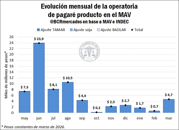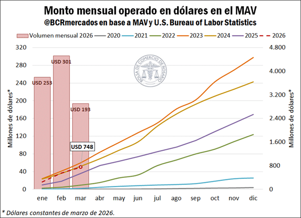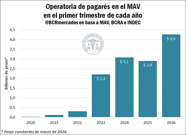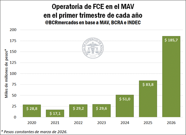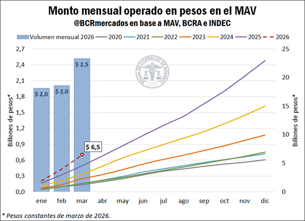 Durante el primer trimestre, se negociaron $6,5 billones en pesos constantes, con un aumento real del 41,1% interanual. En paralelo, las operaciones en dólares también crecieron: alcanzaron US$ 748 millones, un 39,8% más que en 2025.