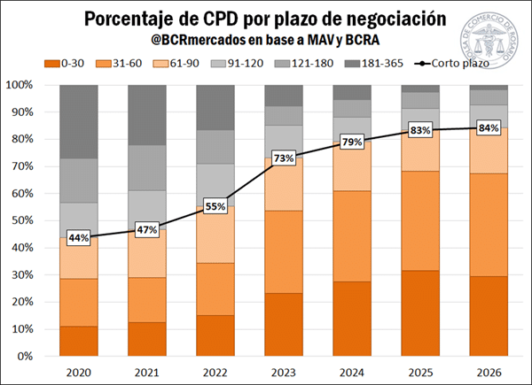 Uno de los cambios más marcados es la preferencia por plazos cortos. El 84% de las operaciones con CPD se concentró en vencimientos de hasta 90 días.