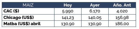 En la rueda de hoy, el valor abierto propuesto por la exportación para el maíz se situó en $ 6.050/t para la entrega hasta el día 15 del corriente mes, en $ 6.000/t para la entrega hasta el 20 y en $ 5.800/t para la descarga. En segmento de negociaciones forwards, se recuperó la actividad con mayor cantidad de compradores dando valores para un mayor número de posiciones y mejoras en los precios ofrecidos, los cuales situaron en US$ 130/t para junio (10 dólares más que ayer), en US$ 122/t para julio (2 dólares por encima de ayer), en US$ 125/t para agosto/octubre, en US$ 128/t para noviembre y en US$ 130 para diciembre. No se descartan mejoras de hasta 2 dólares para las entregas en los últimos 3 meses del año. Por la nueva cosecha, los valores abiertos fueron dados en US$ 138/t para la entrega entre febrero y mayo del próximo año y en US$ 133/t para descargar entre junio y julio de 2020.
