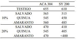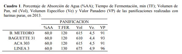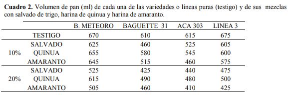 Cuando se panificaron las mezclas, las adicionadas con quinua presentaron los mejores volúmenes de pan, aún con la sustitución del 20%; los panes elaborados con amaranto resultaron los de menor volumen. La variedad de trigo de mejor respuesta al agregado de salvado y harinas de quinua y amaranto fue Buck Meteoro (Cuadro 2).