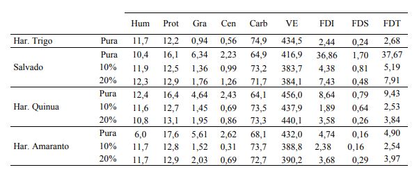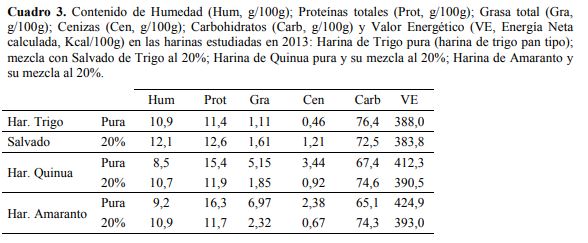 En el cuadro 3, se presentan los resultados de los análisis químicos realizados a las harinas puras de trigo, quinua y amaranto y a las mezclas de harina de trigo con 20% de salvado, harina de quinua y harina de amaranto.