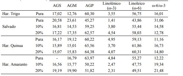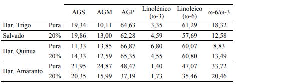 Los granos andinos mostraron los valores de proteínas más altos (15,4% para quinua y 16,3% para amaranto), por lo que las mezclas con 20% de estas harinas presentaron un aumento en el contenido de proteínas respecto a la harina de trigo pura (4 y 3%, respectivamente). El mayor porcentaje correspondió a la mezcla con 20% de salvado de trigo (12,6%), y que representó un incremento del 11%. El amaranto presentó el mayor contenido de grasas (6,97%), en consecuencia, la adición de ésta harina a la de trigo pura elevó el contenido de 1,11 a 2,32% (109% de incremento); la harina de quinua también produjo un aumento en la mezcla con 20%, aunque no tan marcado (67% de incremento), llegó a 1,85% de grasa. En el caso del salvado de trigo, el aumento fue aún menor (45%). Las diferencias en el contenido de cenizas se debieron a que en el caso del trigo se retiró completamente el pericarpio a través del proceso de molienda para tener una harina blanca, en cambio, de las semillas de quinua y amaranto se obtuvo una harina integral, sin eliminar ninguna fracción. Como los dos granos andinos poseen naturalmente porcentajes de cenizas mayores que el trigo, esto se vio reflejado en las cenizas de las mezclas. Sin embargo, la mezcla que dio el mayor valor de cenizas (1,21%) fue la que incorporó 20% de pericarpio de trigo, este incremento fue de 125%, respecto a la harina de trigo pura. El contenido de carbohidratos resultó inferior en las harinas de quinua y amaranto puras con respecto a la de trigo. Las mezclas tuvieron valores intermedios. El valor energético, si bien fue superior en las harinas de quinua y amaranto con respecto al trigo (0,6 y 1% de incremento, respectivamente), esas diferencias no provocaron aumentos importantes en las mezclas. En el caso de la mezcla con salvado de trigo, el valor energético disminuyó respecto a la harina de trigo pura (decreció un 1%). Como se observa en el Cuadro 4, los AGS (Ácidos Grasos Saturados) resultaron más altos en la harina de amaranto que en la de trigo, lo que generó un pequeño aumento en la mezcla con 20% amaranto; en cuanto a la sustitución con 20% de salvado, la concentración de AGS fue levemente mayor, debido posiblemente a la presencia del aceite proveniente del germen en el salvado. La harina de quinua presentó las concentraciones más bajas de AGS, esto coincide con lo descripto por Abugoch, 2009 y Koziol, 1992. Los AGM (Ácidos Grasos Monoinsaturados) aumentaron en todas las sustituciones con harina pero especialmente en la mezcla con amaranto. Los AGP (Ácidos Grasos Poliinsaturados) del trigo, la quinua y sus mezclas no mostraron grandes diferencias pero sí el amaranto, cuya concentración fue muy inferior. En el caso del ω-3 (ácido linolénico), los aumentos importantes se dieron en las mezclas con salvado de trigo (4,59%) y con harina de quinua (4,55%). La concentración de ω-6 (ácido linoleico) fue elevada en todas las muestras analizadas, siendo la más baja la de harina de amaranto y, por consiguiente la mezcla con ese grano.