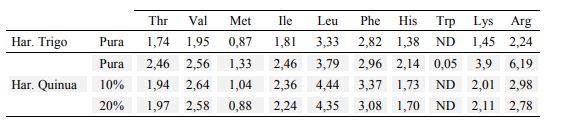 En el Cuadro 9 se observa el contenido de aminoácidos esenciales en harina de trigo pura, en harina de quinua y en las sustituciones al 10 y 20%. Todos los aminoácidos esenciales se encontraron en mayor concentración en la harina de quinua que en la harina de trigo pan (estos datos coinciden con los publicados por Repo-Carrasco et al., 2003), por esta razón, en las mezclas se produjo un aumento para todos los aminoácidos, excepto la Metionina y el Triptófano que se mantuvieron en valores similares a los hallados para la harina de trigo pan pura. Comparando la harina de trigo pura con la sustitución al 20% de harina de quinua, se observó que la Lisina fue el aminoácido que presentó mayor incremento, pasando de 1,45 a 2,11 g/100 g proteína (equivale a un 45% de aumento); algo similar ocurrió con los aminoácidos Valina y Leucina, que mostraron valores 30% más altos y con Isoleucina e Histidina donde el aumento fue de casi un 25%.