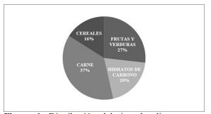 Análisis Sensorial Como se muestra en la Figura 1, se pudo determinar la distribución de los distintos tipos de alimentos consumidos mayoritariamente por los evaluadores. La carne representó el 37%, siendo el tipo de alimento más elegido, las frutas y verduras y los hidratos de carbono mostraron porcentajes de 27 y 20%, respectivamente. Mientras que los cereales resultaron ser los menos consumidos (16%).
