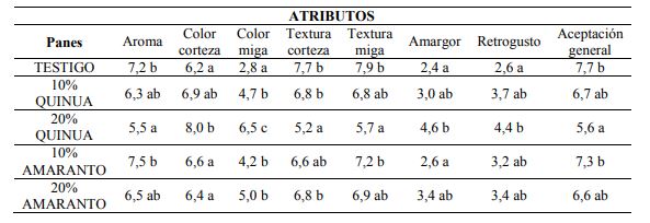 Del análisis sensorial de las muestras surge que los panes sustituidos en un 10% con harina de amaranto resultaron ser los de mayor aceptación general por parte de los consumidores, sin presentar diferencias significativas con el testigo. Los panes elaborados con 20% de harina de quinua, en principio, no tendrían una buena aceptación, lo cual estaría asociado principalmente al amargor y retrogusto de los mismos.