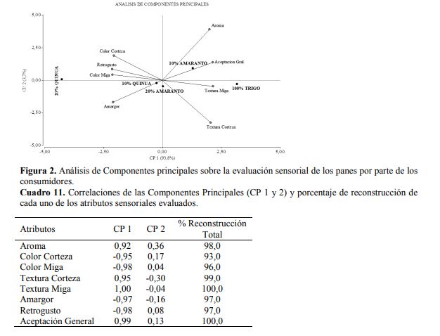 Con los datos obtenidos del análisis sensorial se realizó un ACP (Figura 2), en el cual la primer componente principal (CP 1) explicó el 93,8% de la variación de los datos y la segunda componente principal (CP 2) el 3,7%; esto resultó en una explicación total de los datos del 97,5%. A su vez, el porcentaje de reconstrucción de cada uno de los atributos sensoriales evaluados resultaron ser elevados, con valores mayores al 93,0% (Cuadro 11). La CP 1 separó los panificados evaluados en 2 grandes grupos: los que tuvieron mayor aceptación general, con aroma y texturas más agradables, donde se ubicaron el testigo y los panes realizados con la sustitución 10% de harina de amaranto y; los que estaban asociados a los atributos de menor aceptación, tales como mayor retrogusto, amargor y color más oscuro de corteza y miga, ahí se ubicaron los panes sustituidos con 20% de harina de quinua.