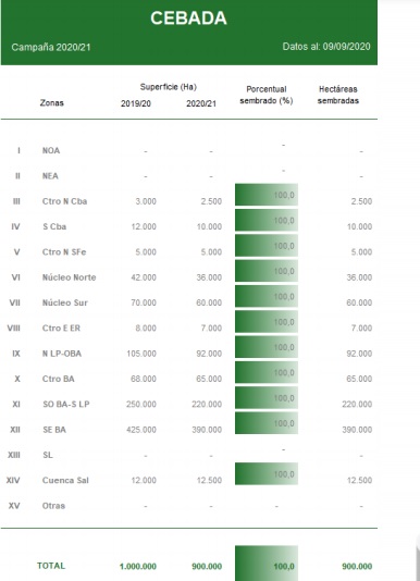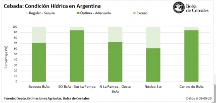 Finalmente, sobre el sur del área agrícola, a pesar de daños relevados por heladas y casos puntuales de mancha en red, el cultivo mantiene una condición entre buena y normal mientras comienza a encañar.