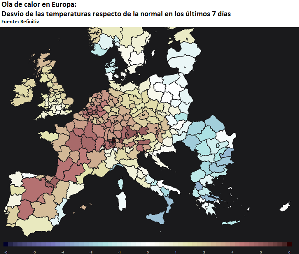 Una ola de calor sin precedentes viene afectando a Europa. En los últimos dos días, se han multiplicado las noticias de temperaturas que baten las máximas históricas en diversas localidades del viejo continente, destacándose los casos de Holanda, Bélgica, Francia y Alemania (ver mapa adjunto). En julio ya comienzan las labores de cosecha en esta parte del orbe, por lo que las condiciones actuales permiten un rápido avance de las labores aunque a costa de un ajuste de la producción esperada.