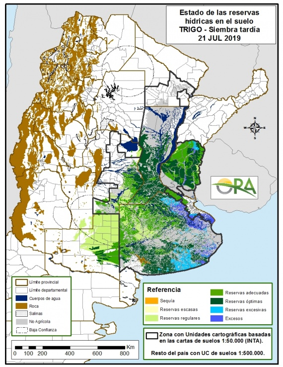 En tanto, el trigo se desarrolla en muy buenas condiciones generales en Argentina. Con una superficie a sembrar que se afianza en las 6,8 – 6,9 Mt, la mayor parte de la zona de influencia de los puertos del Gran Rosario muestra adecuadas reservas de agua, sólo observándose algunos excelsos en el sur de Buenos Aires.