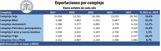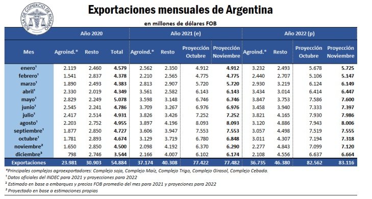 Sin embargo, el resto de las exportaciones espera una sustancial mejora para el 2022, con un crecimiento estimado en torno al 15%. Además del sostén fundamental de la agroindustria en las exportaciones argentinas, se espera un importante flujo de divisas proveniente del comercio exterior de los complejos automotriz, petrolero-petroquímico, oro y plata, entre otros. De esta manera, con exportaciones proyectadas por US$ 83.116 millones, el comercio exterior del año entrante subiría un 7% y superando los US$ 82.981 millones que se exportaron en 2011.
