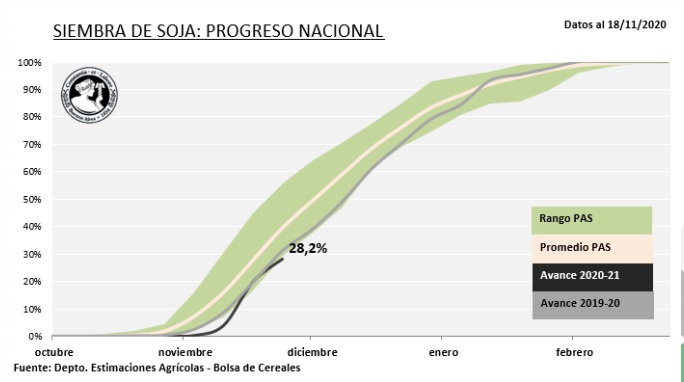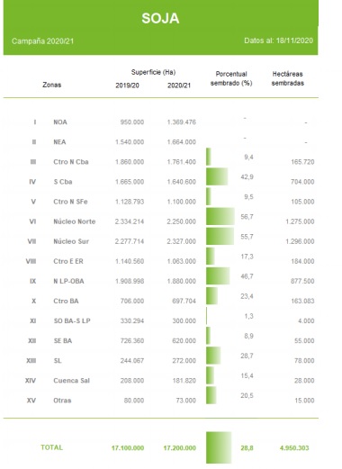 Precipitaciones registradas a lo largo de los últimos 7 días mejoran la humedad superficial en amplios sectores del centro del área agrícola. A la fecha, se estima que un 28,8% de las 17.200.000 Ha proyectadas para la campaña 2020/21 han sido incorporadas al ciclo productivo. Los mayores avances intersemanales fueron informados sobre el Sur de Córdoba, el Norte de La Pampa-Oeste de Buenos Aires y el Núcleo Sur con un progreso intersemanal promedio de 16 puntos porcentuales.