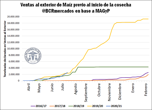 A pesar de la incertidumbre a poco de comenzar la siembra, la buena ventana en los precios externos del maíz sobre la semana pasada para las posiciones de campaña 2020/21, mejoró las ofertas de compra del cereal en el mercado interno por parte del sector exportador, que anotó un alto volumen de Declaraciones Juradas de Ventas al Exterior (DJVE) y, como contracara, cerró ingentes compras en el mercado doméstico. En la semana que terminó el domingo último, las firmas exportadoras anotaron ventas externas por 555.000 toneladas de maíz nuevo, en lo que fue la mayor venta externa semanal de maíz 2020/21 desde que comenzó el registro; en tanto que a fecha del miércoles de la semana que corre, se habían registrado unas 400.000 toneladas adicionales. En total, el sector tiene declaradas al momento ventas para embarcar a partir de marzo de 2021 por 2,5 millones de toneladas, un 8% por encima de la campaña previa, y marcando la mayor premura en la comercialización externa de maíz de la historia.