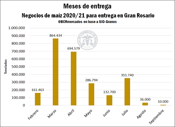 De lo que se lleva comercializado de la nueva campaña, el grueso del volumen corresponde a maíces tempranos, con la entrega marzo destacando con algo más de 850.000 toneladas anotadas, según consta en el registro SIO-Granos. Así, el 80% de los negocios declarados en la plataforma corresponden a maíces con entrega hasta el mes de mayo inclusive.