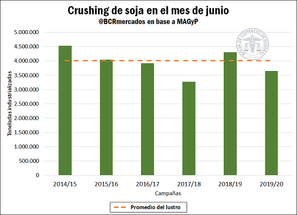En total, en dicho mes se industrializaron 3,6 millones de toneladas de soja, lo que significa una caída del 15% en relación con la cifra del mismo mes del año 2019. Esto plantea una alarma para el sector, al considerar que, quitando la campaña 2017/18 que estuvo marcada por una sequía que provocó un severo recorte en la producción, esta es la industrialización más baja para el sexto mes del año desde la campaña 2011/12.