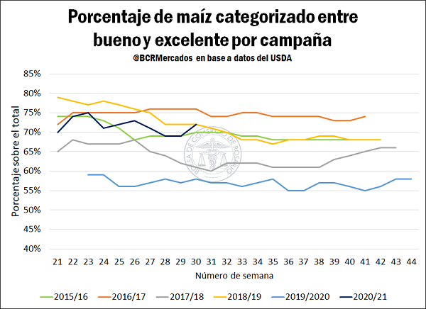 El contexto internacional de los granos gruesos presenta situaciones de apariencia encontradas. Por un lado, el clima más benévolo en las principales zonas productivas de Estados Unidos redundó en una mejora en la condición de los cultivos, aumentando en 3 puntos porcentuales los lotes de maíz y soja categorizados en condiciones entre buenas y excelentes respecto de la semana anterior, de acuerdo al último reporte del Departamento de Agricultura de los Estados Unidos (USDA).