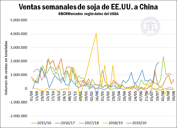 Las compras de maíz estadounidense realizadas por China también venían mostrando altos volúmenes, y en la jornada del país asiático efectuó su mayor compra diaria del cereal americano, por 1,937 Mt. Finalmente, teniendo en cuenta el acuerdo comercial al que se llegó a principios de año, restaría considerar cuáles son las posibilidades concretas de que se cumpla con los pactado, ya que, por un lado, algunos analistas afirman que el volumen de negocios no alcanzaría para alcanzar los objetivos, pero, por otro lado, los nuevos y reiterados récords de compras diarias reafirmarían el compromiso o la intención de cumplir con dicho acuerdo.