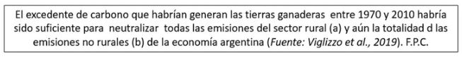 E. Viglizo en 2019 en el Seminario de la FPC mostró claramente como en Argentina el secuestro de Carbono en el sector rural, dado por la fijación de Carbono de los pastizales naturales y cultivados, supera ampliamente a las emisiones de GEI y de esa forma se genera un Balance de Carbono con un crédito positivo que neutraliza las emisiones no rurales.