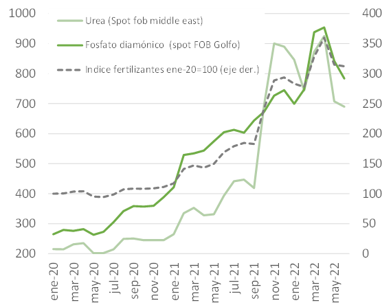 Ya en 2022 la situación continuó con un alto grado de volatilidad. La invasión rusa de Ucrania en febrero condujo a una dramática alza en los precios, reflejando las preocupaciones sobre el efecto que la guerra tendría sobre las exportaciones rusas de fertilizantes y, por extensión, en el suministro mundial de estos insumos, dado que las exportaciones rusas son las más grandes, en valor, del mundo (Fernández, 2022)