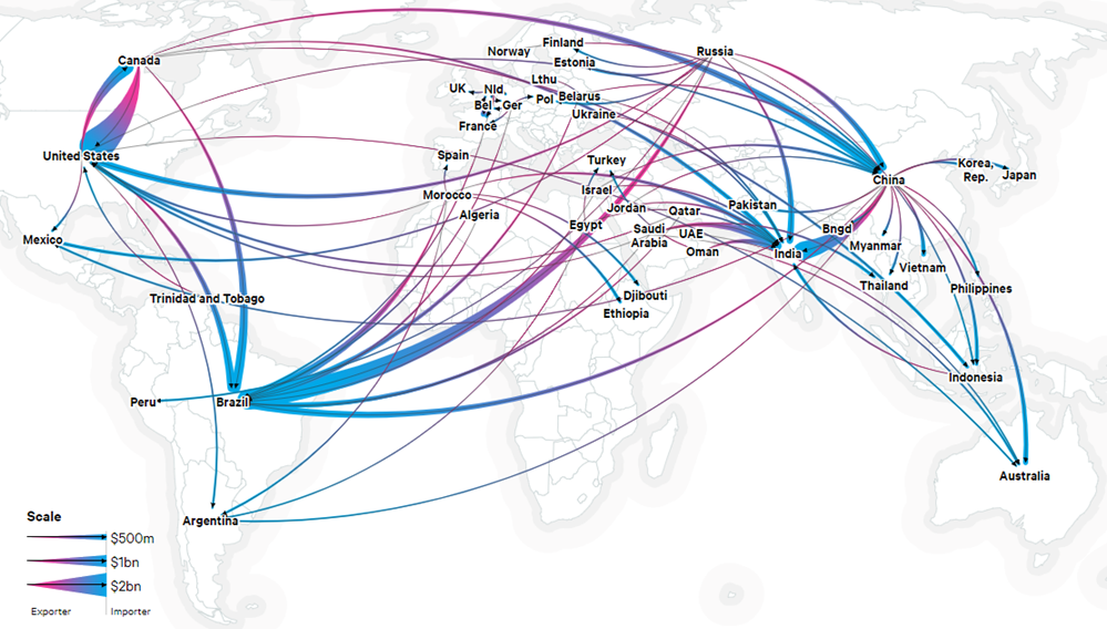 Como se puede observar en el Gráfico 2, Rusia, China, Canadá y Marruecos son los principales exportadores netos de fertilizantes. Rusia participa en un 14% del comercio global, seguido por China que representa el 12%, por lo que los cambios en dichos países son de importancia para el comercio global de estos insumos.