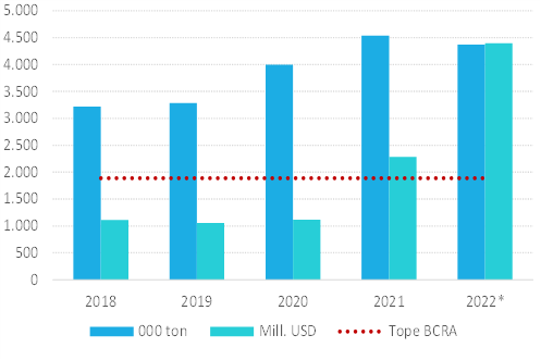 Además de la situación que se deriva de la volatilidad en los mercados internacionales, Argentina se encuentra ante una escasez de divisas que llevó al banco central (BCRA) a fijar en marzo cupos al acceso al mercado de cambios para importaciones[3], que implican que en 2022 se podría importar por un monto equivalente al menor: del valor de las importaciones FOB de 2021 más un 5%, o de las importaciones del año 2020 más un 70%, prorrateado por mes, con la posibilidad de adelantarse hasta un 20% del cupo anual.