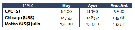 La mejor oferta abierta de compra por maíz con descarga inmediata se ubicó en los US$ 130/t, aunque no se descarta la posibilidad de obtener mejoras en este valor. Por maíz con entrega contractual el valor ofrecido se situó en los US$ 133/t. La posición abril/mayo y junio no presentaron cambios, con un valor abierto de compra que se ubicó en los US$ 135/t y US$ 133/t respectivamente.