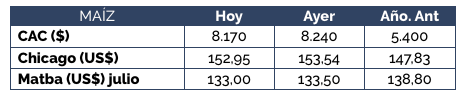 En la rueda del día, el precio de compra por maíz con entrega contractual se ubicó en los US$ 137/t, sin cambios respecto a la sesión previa.