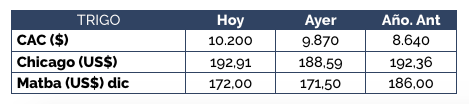 Al igual que en la jornada de ayer, hoy el mercado de trigo presentó un importante dinamismo, acaparando un considerable volumen de negocios. Se registró un valor abierto de US$ 175/t para el cereal con descarga entre el 15/12 y el 15/1, aunque se concretaron negocios por este mismo valor para el cereal con entrega entre el 15/10 y el 15/11,