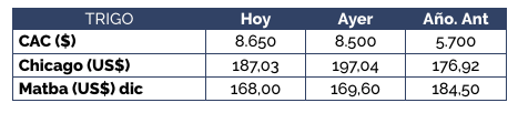 En la rueda de hoy, se llegó a ofrecer abiertamente por parte de la exportación US$ 205/t por trigo con entrega contractual, sin embargo, no se descartan mejoras en este precio. Para las posiciones noviembre/diciembre/enero el precio ofrecido fue de US$ 165/t, mismo valor que el ofrecido la sesión anterior. Además, el precio abierto fue de US$ 168/t para la posición febrero de ese año, aumentando en US$ 2/t para el mes siguiente.