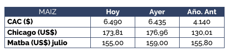 MAIZ: Baradero: Retirados – Chacabuco: Retirados. Lima/TLP: Se ofrecieron  u$150 c/descarga . Bahía Blanca: Se ofrecieron u$152 c/descarga ctual. Necochea: Se ofrecieron u$155 c/descarga. MAT Rosario 07/19: u$s 155,00 (-4,00); 09/19: u$s 153,70 (-4,30)