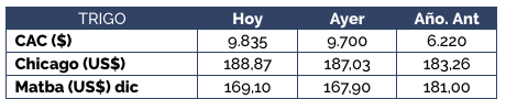 El precio por el trigo con descarga sintió una mejora de tres dólares, ofreciéndose por parte de la demanda en US$ 165/t. Este mismo precio se ofreció para el trigo con descarga en el mes de diciembre.