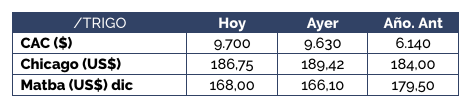El mejor valor abierto de compra por trigo con descarga inmediata se situó en los US$ 162/t, aunque se podían conseguir US$ 165/t con entrega a partir del lunes próximo. En cuanto al trigo con descarga en diciembre, el mejor valor fue también de US$ 165/t. Para la descarga entre el 15/12 y el 15/1 el mejor precio de compra fue de US$ 166/t, con enero siendo ofrecido en US$ 170/t. Para la descarga en el mes de febrero, el mejor valor abierto fue de US$ 172/t, con la mejor oferta por trigo marzo en US$ 175/t.