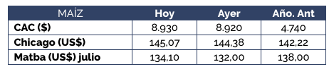 En relación al maíz de la campaña próxima, para la descarga en entre marzo y abril el mejor valor de compra se situó en los US$ 140/t, mejorando en relación a la jornada previa. En lo que refiere al maíz de segunda, el mejor valor abierto para la descarga en junio se situó en US$ 135/t, mismo valor que para la descarga entre el 15/6 y el 15/7. En cuanto al maíz con descarga en julio, el mejor valor fue de US$ 133/t, con agosto siendo ofrecido en US$ 130/t.