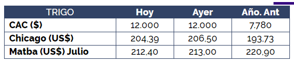 El valor abierto de compra por el cereal con descarga inmediata se ubicó en los US$ 195/t, sin variación con respecto a la jornada previa. No se registraron ofertas de compra por trigo con entregas diferidas ni de la nueva campaña.