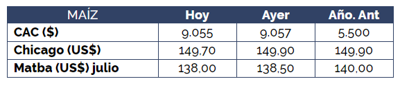 Se registró una oferta de compra por mercadería con entrega entre el 15/5 y el 15/6 que se ofreció en US$ 142/t. En cuanto al maíz junio, se repitió el valor de US$ 141/t, con la descarga entre julio y octubre ofreciéndose en US$ 135/t, para subir a US$ 137 para la descarga entre noviembre y diciembre.