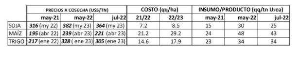 - SOJA: en mayo del año pasado, el precio futuro a cosecha 21/22 era de U$S 316/TN, muy inferior al precio realmente alcanzado este año y a los precios futuros para la 22/23, a pesar de las recientes bajas. Pero los costos de la 21/22 se presentan inferiores a los de la 22/23, debido a la suba de precios en Dólares de muchos insumos, fertilizantes y algunos herbicidas principalmente. Estos altos costos, a pesar del potencial pago con granos a más precio, se traduce en mayor volumen de soja a vender para cancelarlos. Así, el costo de implantación para la 21/22 se pagaba con 7,2 quintales de soja, mientras hoy la 22/23 necesita de 8,5 quintales para ser implantada. En la medida que los precios de los granos sigan bajando, se necesitará más quintales de soja para saldar los costos de implantación. A modo de ejemplo, se tomará la Urea, por ser uno de los fertilizantes más usados, para profundizar en la relación insumo/producto. Es decir, cuanto producto, en este caso soja, se necesita para pagar el insumo. En mayo del año pasado, con 15 toneladas de soja al futuro mayo 22, se pagaba una tonelada de urea, mientras a mayo de este año, se necesitaba exactamente el doble, por la suba de precios de la urea, muy superior a la suba de precios de la soja. Las bajas de los fertilizantes dadas en las últimas semanas, junto a las bajas de precios de los granos, logran disminuir levemente la relación insumo/producto, de 30 quintales de soja al precio de mayo 23. En la actualidad se necesitan 25 quintales, pero sigue siendo muy superior a los 15 quintales del año pasado.