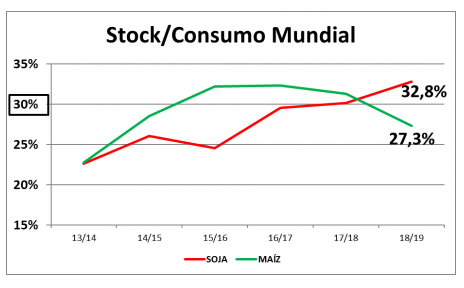 Miremos entonces, según ese último informe del USDA y conociendo que aún Argentina y Brasil no estiman grandes recortes productivos de soja o maíz, la evolución de la relación stock/consumo de soja y maíz a nivel mundial.