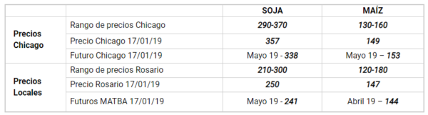 Las variaciones de precios que pueden ocurrir tanto en precios disponibles como a cosecha, serán de dimensiones tan grandes como el impacto que el mercado perciba que puede tener el clima en los volúmenes de cosecha, y del impacto que estos volúmenes tengan sobre el volumen global de granos, según los stocks disponibles y el consumo proyectado para este año. Estos últimos datos, que actualiza mes a mes el Departamento de Agricultura de Estados Unidos (USDA), no están disponibles dado el cese de actividades de esta institución las últimas semanas, por lo que el último informe emitido fue en el mes de diciembre de 2018.