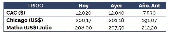 En el día de hoy, en el mercado de trigo destacó una caída en el valor abierto de compra por mercadería disponible y la aparición nuevamente de ofertas abiertas para entregas diferidas. Los volúmenes comercializados en este mercado, por otra parte, sigue manteniéndose en niveles sumamente discretos.