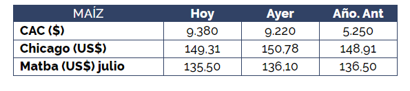 El valor abierto de compra por maíz con entrega hasta el 20/2 se ubicó en los US$ 155/t, mismo valor que en el día de ayer. Si se pretendía aplazar el plazo de entrega hasta el 28/2, la oferta bajaba hasta los US$ 153/t.