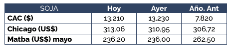 En el segmento de soja de nueva campaña no se registraron valores abiertos, sin embargo en los registros oficiales se contabilizan operaciones por US$ 235/t para la posición mayo.