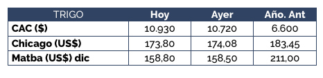 El valor ofrecido abiertamente por trigo contractual fue de US$ 195/t, al igual que en el día de ayer. Además, se registró un precio abierto de $ 11.100/t para el cereal con entrega hasta el décimo día de septiembre. En cuanto al trigo de nueva cosecha, para el mes de noviembre tuvo un valor abierto de US$ 158/t, sin variaciones con respecto a la sesión anterior. En cuanto al trigo con entrega en el mes de diciembre el valor abierto fue de US$ 155/t, con US$ 158/t para el mes de enero. En cuanto a los negocios con entrega en marzo el precio ofrecido fue de US$ 160/t.