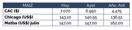 En cuanto al maíz de nueva campaña, para las posiciones de marzo/abril el valor ofrecido fue de us$ 135/t, sin variaciones para marzo pero sí manifestándose un aumento en el precio para el mes de abril. Con respecto a mayo, el precio también fue superior al de ayer, situándose en los US$ 137/t. Por último, el precio abierto para junio fue de US$ 128/t, disminuyendo en US$ 1/t para el mes siguiente.