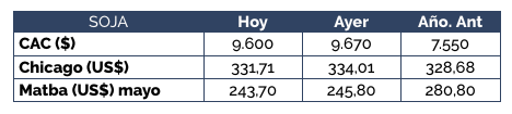 En la tarde de hoy, el valor ofrecido abiertamente por la oleaginosa condición fábrica con entrega inmediata se ubicó en $ 9.500/t. El precio, comenzado el día de negocios, había abierto en $ 9.400/t para luego aumentar en $ 100/t al finalizar la rueda de negocios. Además, se registró un precio de $ 10.000/t para los negocios de la posición del mes de octubre. No se registró actividad considerando los meses de noviembre y mayo. A modo de síntesis la negociación por soja fue escasa a lo largo del día, al igual que el día de ayer.