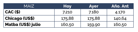 Siendo el segmento de mayor participación en el mercado, en la jornada de hoy, el precio del maíz con entrega contractual se ofreció para la compra a US$ 160/t con entrega hasta el 28/6. Este segmento del maíz fue el de mayor volumen registrado junto con las posiciones de julio/agosto/septiembre, donde el precio abierto ofrecido se situó también en US$ 160/t, registrándose un aumento de precios.