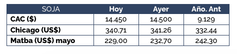 En la jornada de hoy, volvimos a tener valores abiertos de compra por soja disponible, con dos compradores activos en el mercado ofreciendo US$ 230/t por la oleaginosa condición fábrica. Aun así, no se registraron negocios por volúmenes significativos.