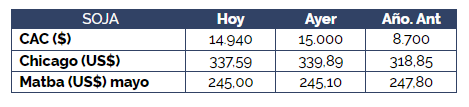 En la jornada de hoy, tuvimos una magra actividad en el mercado de soja, con baja en el valor abierto por mercadería disponible y menos compradores suscribiéndolo.