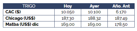Por trigo con descarga, el valor abierto fue de US$ 167/t, aunque se podía conseguir una mejora en este valor. En cuanto al trigo con descarga en diciembre, el mejor precio de compra fue de US$ 168/t, sin variación en relación a la jornada previa. Por trigo con descarga entre el 15/12 y el 15/01 el precio de compra fue de US$ 171/t.
