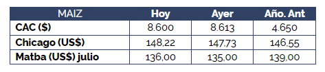 En cuanto al maíz de campaña 2019/20, tuvimos una baja en los valores ofrecidos. Por maíz con descarga entre marzo y mayo, el mejor precio de compra se ubicó en los US$ 140/t, cinco dólares menos que el viernes. En cuanto al maíz de segunda, para la posición junio el valor abierto fue de US$ 135/t, con julio/agosto en US$ 133/t.