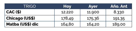 El precio ofrecido abiertamente por trigo con entrega hasta el 27/9 fue de US$ 210/t, aunque las mejoras en este precio resultan muy probables. Para el cereal con descarga hasta el 4/10 fue de US$ 200/t, aunque no se descartan mejoras en este valor.