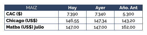 El precio ofrecido abiertamente por maíz disponible fue de US$ 127/t, aunque al igual que ayer este precio se incrementaba en US$3/t para entregas a partir del 30/9. El precio se ubicó en los US$ 133/t para noviembre y US$ 137/t para el mes de diciembre. Además, se ofrecieron US$ 140/t para negocios con descarga en enero de 2020. Todos valores idénticos a los de la sesión anterior.